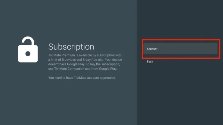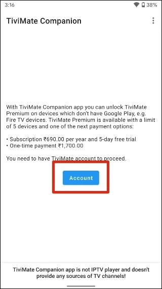 4. L’écran suivant vous demandera d’acheter TiviMate Premium à l’aide de l’application Android TiviMate Companion. Nous l’avons déjà fait. Cliquez sur le bouton Compte .